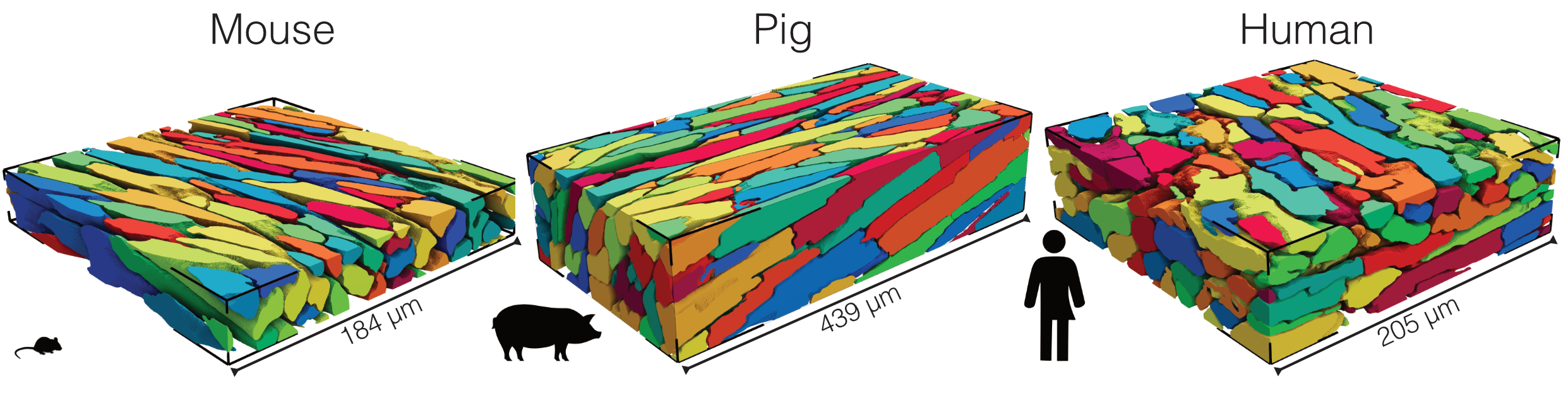 Figure: Examples of artificial intelligence-enabled 3D cardiomyocyte reconstructions from confocal microscopy image volumes acquired from mouse, pig, and human ventricular tissues. Manual segmentation of shown stacks typically requires days to weeks of focused effort.