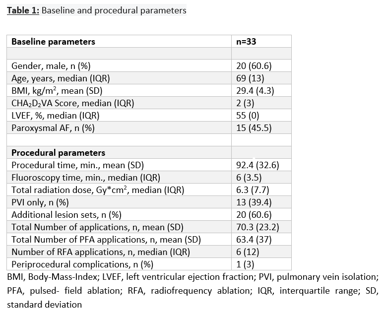 Results: A total of 33 patients (median age 69 years, 61% male, 46% suffering from paroxysmal AF) undergoing AF ablation were analyzed, including 20 (61%) reablation procedures. Mean total number of applications and mean number of PFA-applications was 70 ± 23 and 63± 37 (Table 1). A significant increase in lactatdehydrogenase (LDH) levels by 78.5% (197 ± 33 vs. 251 ± 51 U/L, p<0.001), total bilirubin levels by 73.8% (0.59 ± 0.35 vs. 0.8 ± 0.3 mg/dl, p<0.001), direct bilirubin levels by 49.2 % (0.3 ± 0.23 vs. 0.49 ± 0.61 mg/dl, p=0.03) and decrease in haptoglobin levels by 10.8% (120 ± 53.3 vs. 107 ± 46.3 mg/dl, p=0.023) was documented within 24 hours after the procedure compared to baseline (Figure 1). No significant changes in creatinine levels (1.02 ± 0.3 vs. 0.98 ± 0.29 mg/dl, p= 0.064), as an indicator of renal failure, were observed after the procedure. Hemolysis parameters did not correlate significantly with the total number of PFA applications (∆Haptoglobin mg/dl, r=0.2, p=0.31; ∆Bilirubin mg/dl, r=0.22, p=0.26; ∆LDH U/L, r=0.05, p=0.81).