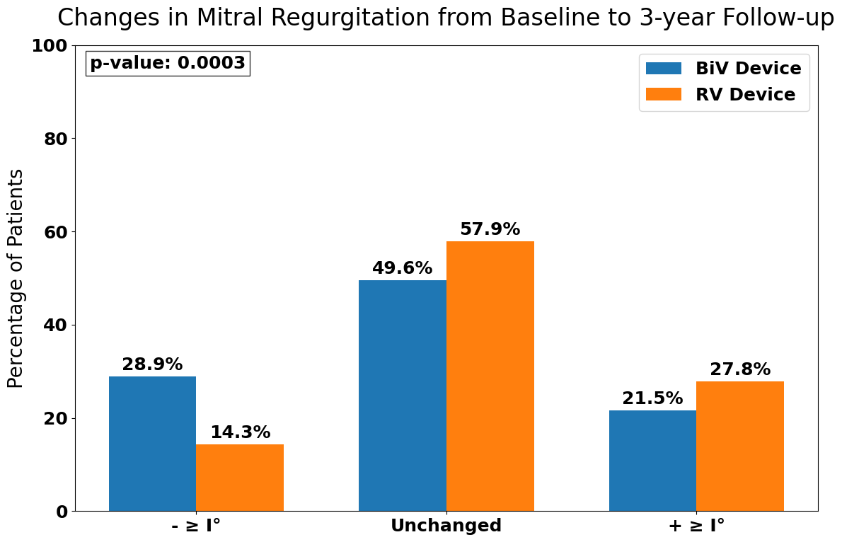 Median age was 68 years [IQR: 57-76], with 419 (76.3%) being male. Of these patients, 21.5% received an ICD, 30.4% a PM, and 48.1% a CRT device (RV: n = 285; BiV: n = 264). BiV patients had worse left ventricular (LV) function. At three-year follow-up, MR had decreased by one or more degrees in 28.9% of patients in the BiV group compared to only 14.3% in the RV group. Furthermore, MR had increased by one or more degrees in 27.8% of cases in the RV group (compared to 21.5 % in the BiV group). This difference met statistical significance (P < 0.001).