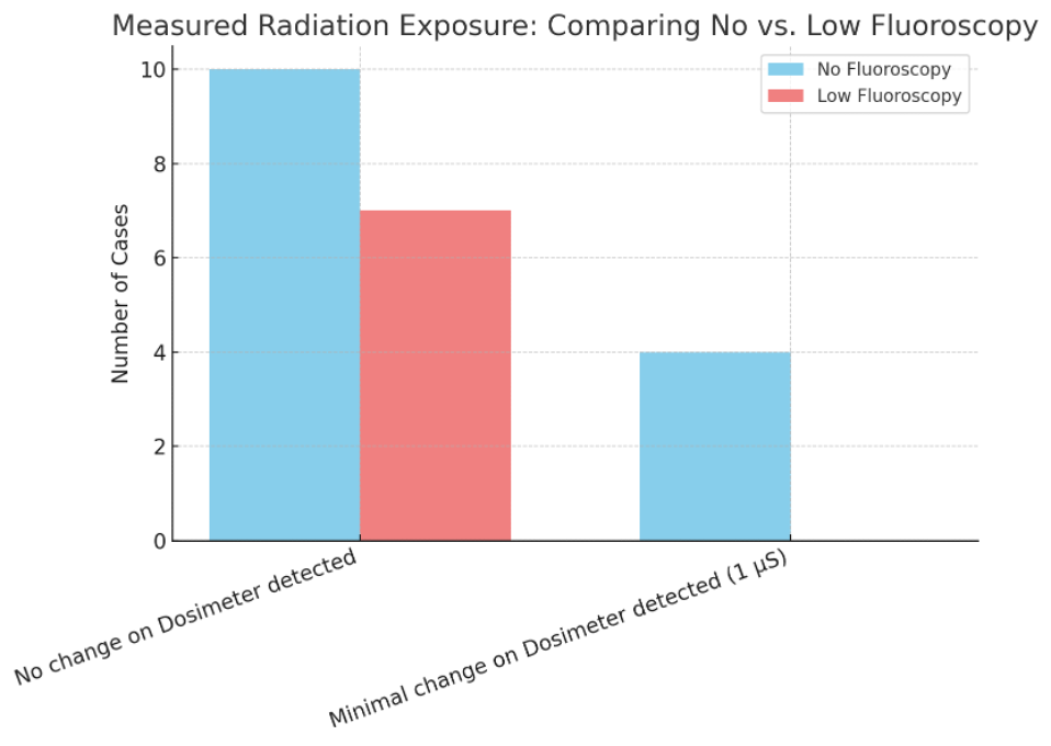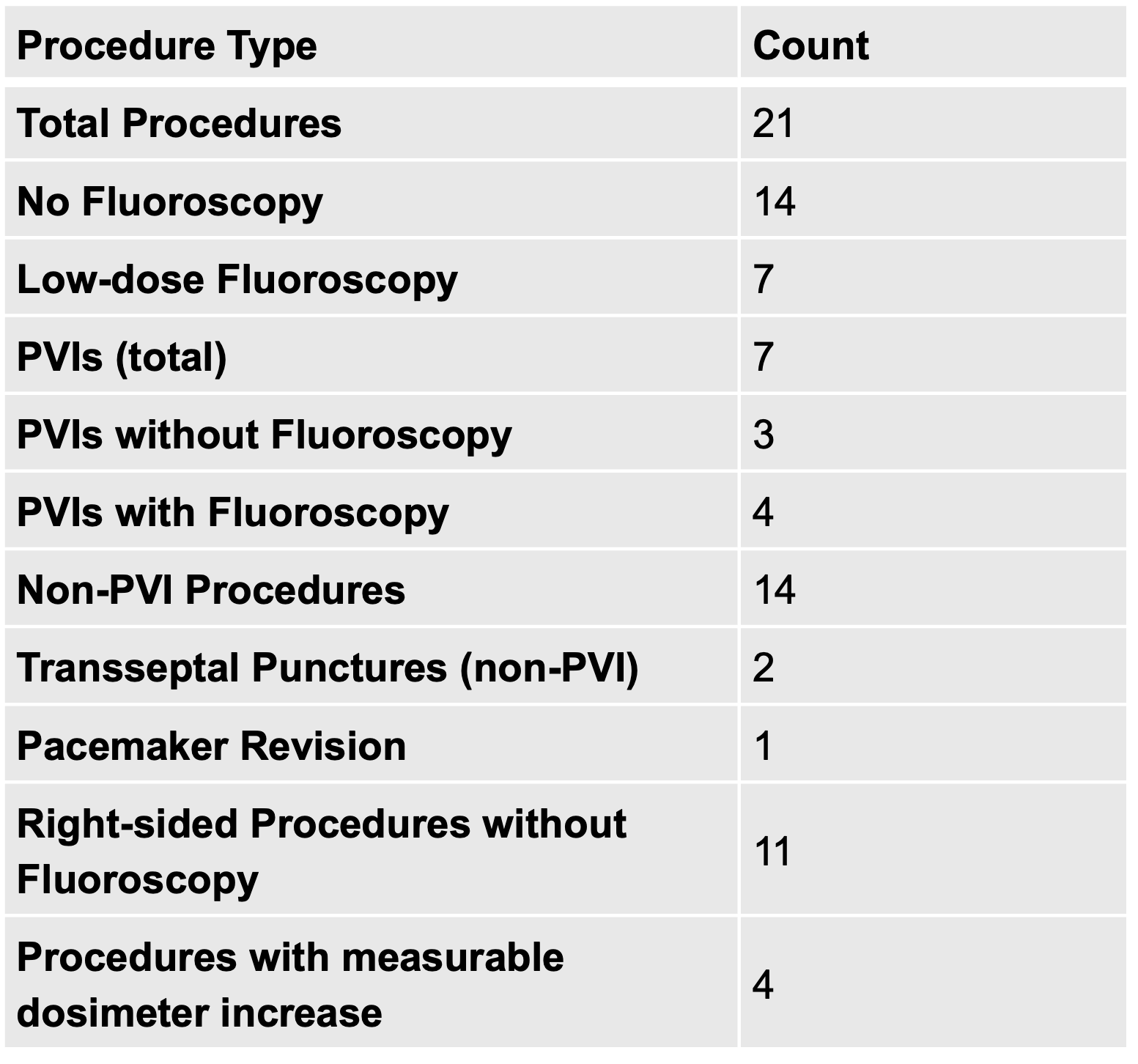 The maximum permissible cumulative fetal radiation dose during pregnancy is 1 mSv. During 21 procedures across the first two trimesters, the operator’s total occupational exposure was 149 µSv—well below this threshold, even when accounting for background radiation such as cosmic rays (~1 µSv/day). Of the 21 procedures, 14 were completed without fluoroscopy; the remaining 7 used low-dose settings. Among 7 pulmonary vein isolations (PVIs), 3 were fluoroscopy-free, 4 required low-dose fluoroscopy. Of 14 non-PVI procedures, fluoroscopy was used in only 3 cases: two left-sided ablations (WPW and atrial tachycardia) requiring transseptal puncture, and one pacemaker pocket revision. All right-sided procedures—including CTI ablation, AVNRT, and right atrial tachycardia—were completed without fluoroscopy. Dosimeter readings rose by 1 µSv in only 4 procedures. These increases did not correlate with fluoroscopy use, suggesting background radiation or dosimeter sensitivity. Chi-square analysis showed no significant association between fluoroscopy use and exposure (χ²(6) = 2.47, p = 0.116), procedure type and exposure (χ²(6) = 8.96, p = 0.25), or exposure and patient BMI or procedure recurrence.