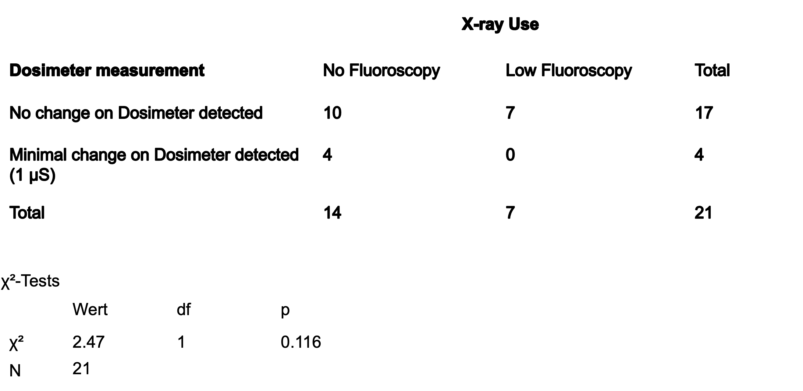 We retrospectively analyzed 21 consecutive EP procedures performed by a pregnant operator at Klinikum Fürth, Bavaria, Germany. Dosimeter readings (µSv) before and after each procedure determined net exposure. Variables included fluoroscopy use/time, dose-area product (DAP in cGy·cm²), procedure type, and patient factors. The operator wore a full-overlap 0.5 mm Pb apron, 0.5 mm thyroid collar, protective glasses, and used ceiling-mounted shields and table drapes. Optimal table positioning was consistently maintained. Most procedures used 3D electroanatomical mapping and transesophageal echocardiography (TEE) to reduce or eliminate fluoroscopy. The Siemens Artis Zee system operated at 1 frame/second throughout.