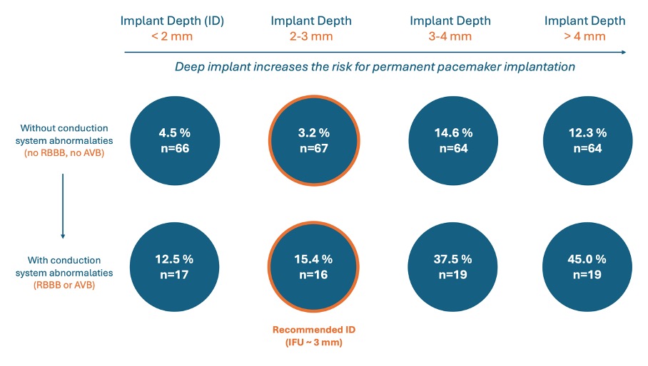 Figure 1: Pacemaker implantation rate by implant depth quartiles and conduction system abnormalities with the self-expanding NAVITOR valve