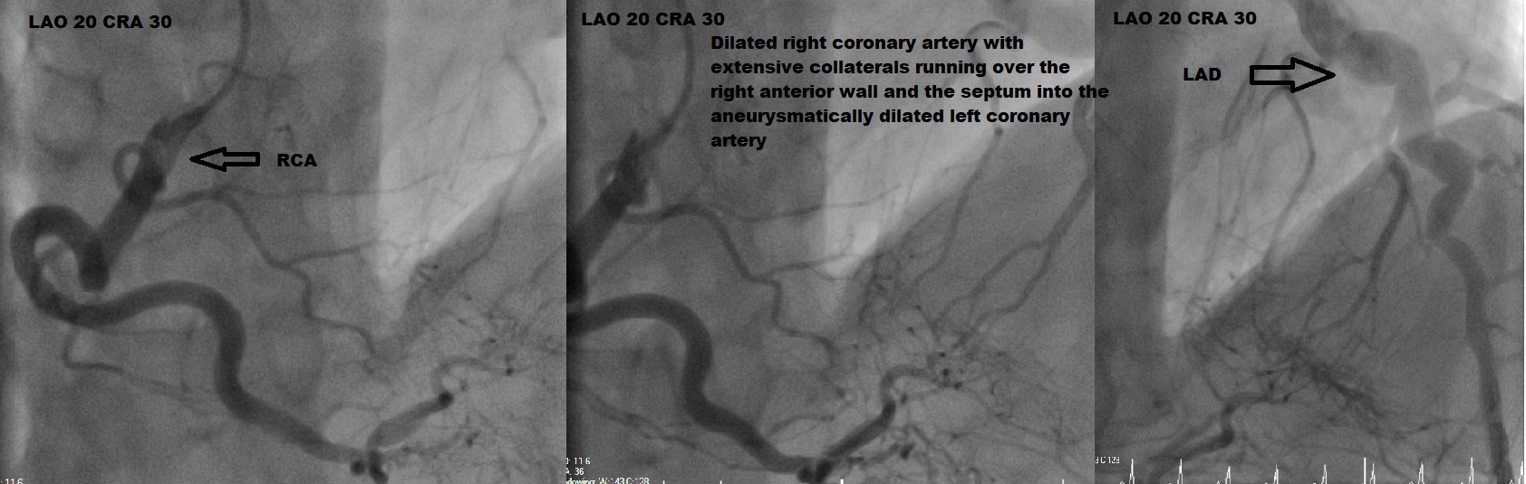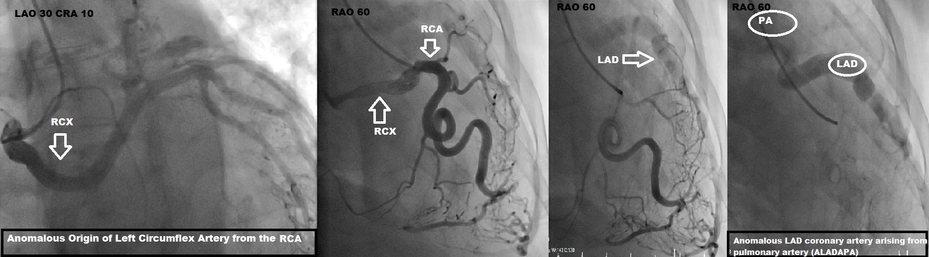 We report a case of a 52-year-old male who presented with progressive exertional dyspnea and clinical signs of heart failure. Electrocardiography showed no typical signs of ischemia. Laboratory findings showed significantly elevated N-terminal pro-B-type natriuretic peptide. Transthoracic echocardiography revealed severely impaired left ventricular ejection fraction. Coronary angiography was performed and showed a complex double coronary anomaly with an anomalous origin of the left coronary artery from the pulmonary artery with extensive collateralization from the right coronary artery supplying the left coronary system. Additionally, an anomalous origin of the circumflex artery from the right coronary artery with benign course, which is one of the most common coronary artery anomalies, was found. The diagnosis was subsequently confirmed by computed tomographic (CT) coronary angiogram with 3D reconstruction, which showed ectatic RCA arising from the right coronary sinus and the left descending artery arising from the pulmonary artery. Cardiac Magnetic Resonance (MR) demonstrated thinning of anterolateral wall of the left ventricle with sub endocardial delayed gadolinium enhancement.