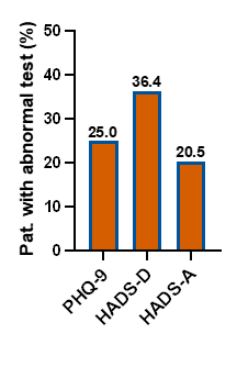 Results: In the nationwide claims dataset, the prevalence of depression in obstructive HCM patients was 33.9%. Increased risk of depression was associated with older age (aOR 2.38; 95% CI 1.30–3.95) and female sex (aOR 2.06; 95% CI 1.88–2.26; both p < 0.001). Additional potential risk factors included receipt of unemployment benefits (aOR 2.19; 95% CI 0.78–1.25; p < 0.001), syncope (aOR 1.40; 95% CI 1.16–1.69; p < 0.001), and heart failure (aOR 1.20; 95% CI 1.08–1.32; p < 0.001). Beta-blocker (aOR 0.81; 95% CI 0.73–0.90; p < 0.01) and calcium-channel-blocker therapy (aOR 0.68; 95% CI 0.58–0.79; p < 0.001), German nationality (aOR 0.41; 95% CI 0.35–0.49; p < 0.001), and higher education level (aOR 0.67; 95% CI 0.44–1.01; p < 0.05) were associated with reduced risk (Table 1). These data were confirmed and extended using detailed questionnaires in patients with obstructive HCM. Clinically significant depressive symptoms were identified in 25.0% of patients using the PHQ-9 and 36.4% using the HADS-D; anxiety symptoms (HADS-A) were present in 20.5% (Figure 1). Higher NYHA class strongly correlated with PHQ-9 (ρ = 0.66), HADS-D (ρ = 0.64), and HADS-A scores (ρ = 0.53; all p < 0.001). PHQ-9 and HADS-D scores showed a strong correlation (ρ = 0.84; p < 0.001).