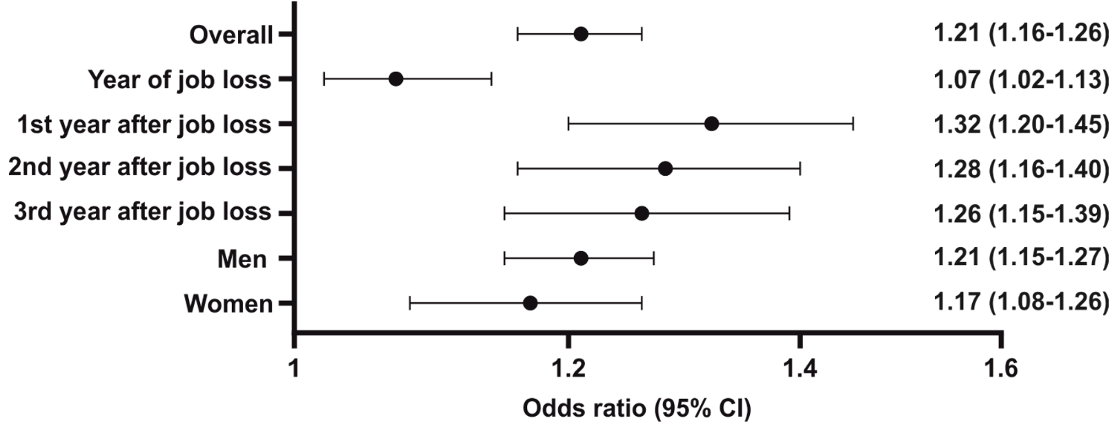 Men had a slightly higher risk of MACE (OR 1.21, 95%CI 1.15-1.27) compared to women (OR 1.16, 95%CI 1.08-1.24). Notably, all-cause mortality was also higher among individuals with job loss (OR 1.17, 95%CI 1.08-1.26) during the observation period.