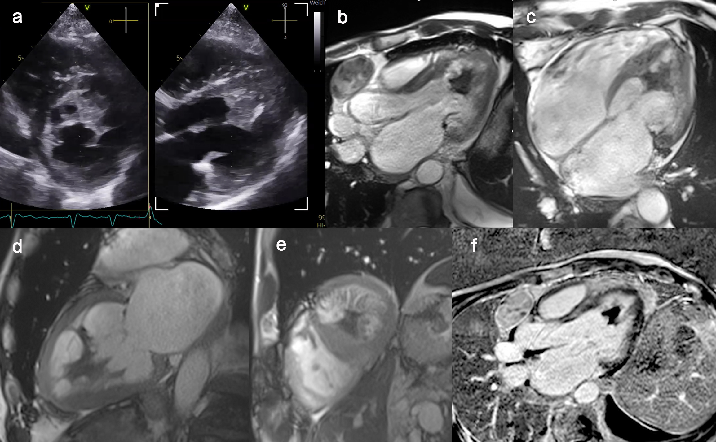 Figure 1: Echocardiography and magnetic resonance imaging of a non-dilated cardiomyopathy, non-bacterial thrombotic endocarditis and a left ventricular thrombus appearing as a “Batman signal” in the left ventricle