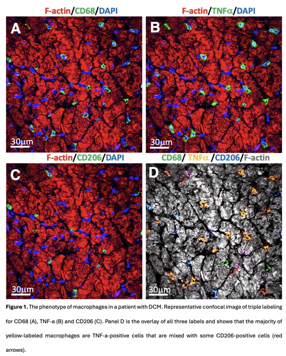 Methods: Ventricular biopsies from patients with HF due to dilated (DCM, n=7), ischemic (ICM, n=7), and inflammatory (InfCM, n=7) cardiomyopathy, and 5 control patients were studied. N undergoing NETosis were quantified using a triple labeling with CD66b, citrullinated histone 3 (citH3), and myeloperoxidase (MPO). The total number of Mf was determined using a CD68 antibody. M1 macrophages were determined by triple labeling with CD68 and TNFalpha, IL-1beta, and IL-6. M2 macrophages were determined using CD68, arginase I, and CD206 (Figure 1).