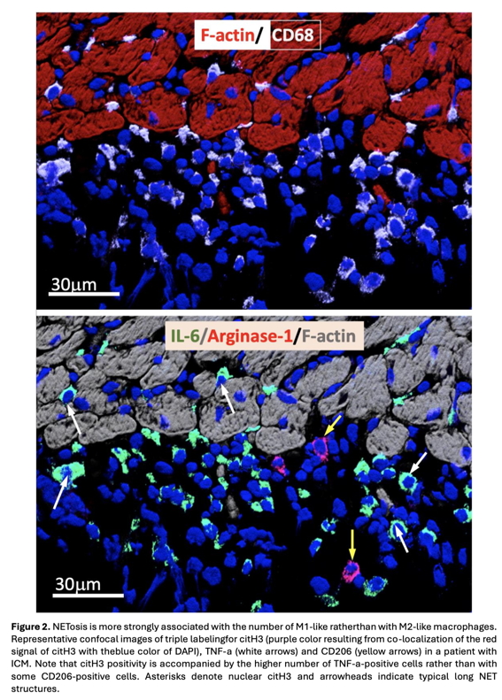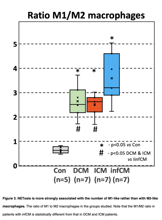 Conclusion: Accumulations of N and Mf are typical features of chronic myocardial inflammation in HF, regardless of its etiology. An increased number of N undergoing NETosis in HF is associated with the activation of myocardial Mf and switches these cells towards a proinflammatory M1-like phenotype.