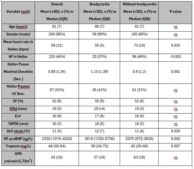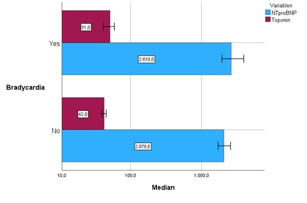 Bradycardia, defined as a mean Holter-ECG HR ≤ 60 bpm, was associated with higher levels of NT-proBNP and troponin T when compared to patients without bradycardia (table). Further, the presence of pauses ≥2 seconds were also associated with higher NT-proBNP levels (median 2700 ng/L (1905–4595) vs. 1710 ng/L (710–3773). Although a trend toward higher troponin T levels was observed in patients with pauses, it did not reach statistical significance (p = 0.074).