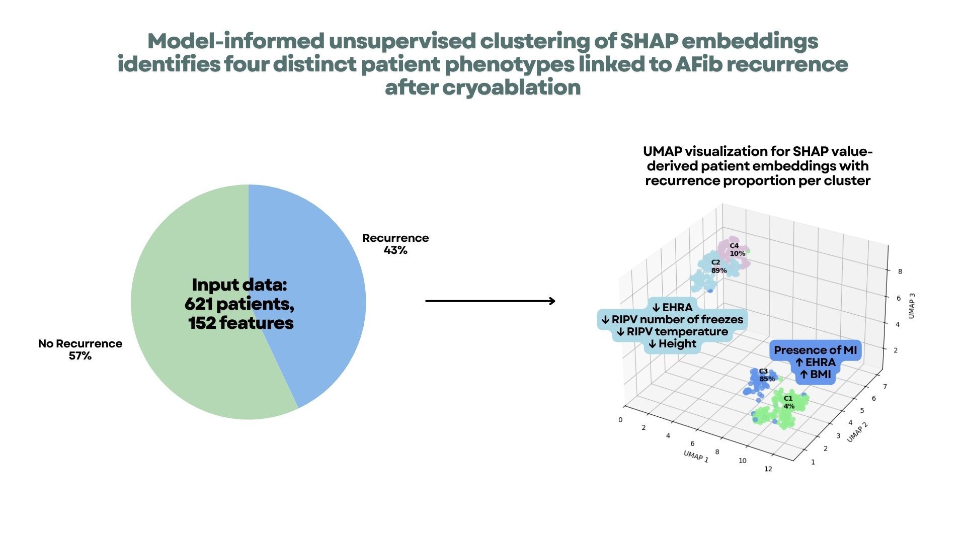 Unsupervised learning on model-derived embeddings revealed four reproducible patient–procedure phenotypes with markedly different recurrence risks (4–89%). This approach captures multivariate, non-linear patterns—spanning cryo dosing, temperatures, and clinical comorbidity profiles—that are not readily detected with conventional univariate or standard multivariable analyses. If validated prospectively, such phenotyping could enable pre-procedural risk stratification, guide intraprocedural dosing strategies, and inform enrichment/stratification in future trials.