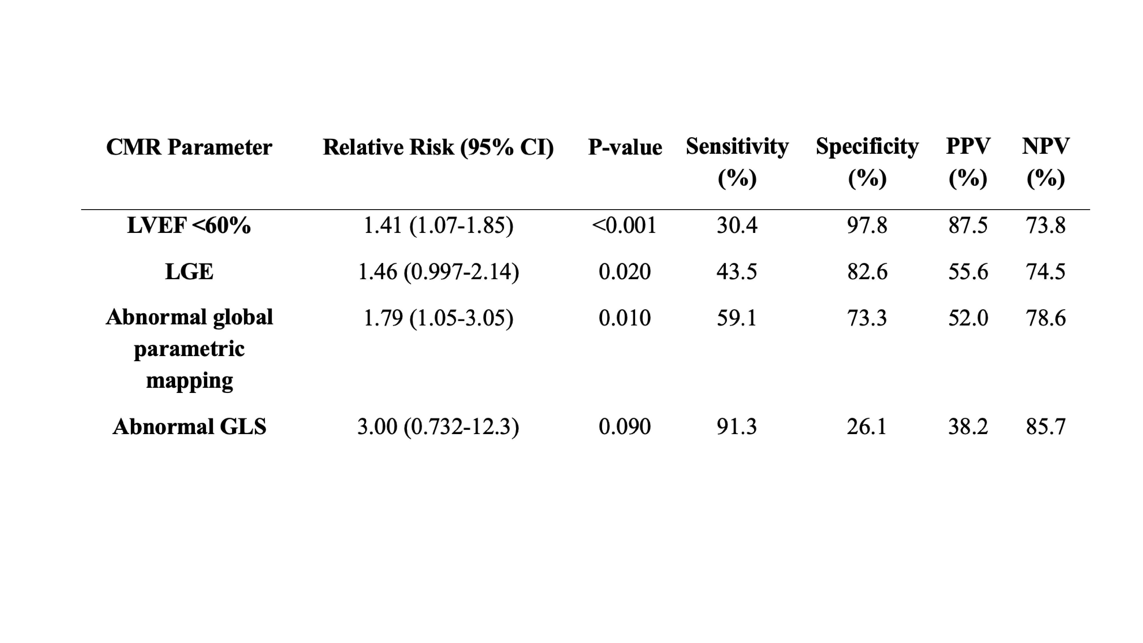 Conclusion: Our data suggest that among patients with suspected cardiac sarcoidosis not only LGE and LVEF but also parametric mapping and GLS may enhance the prognostic ability of CMR. These data support the necessity of future larger studies to further evaluate these predictors of an adverse outcome.