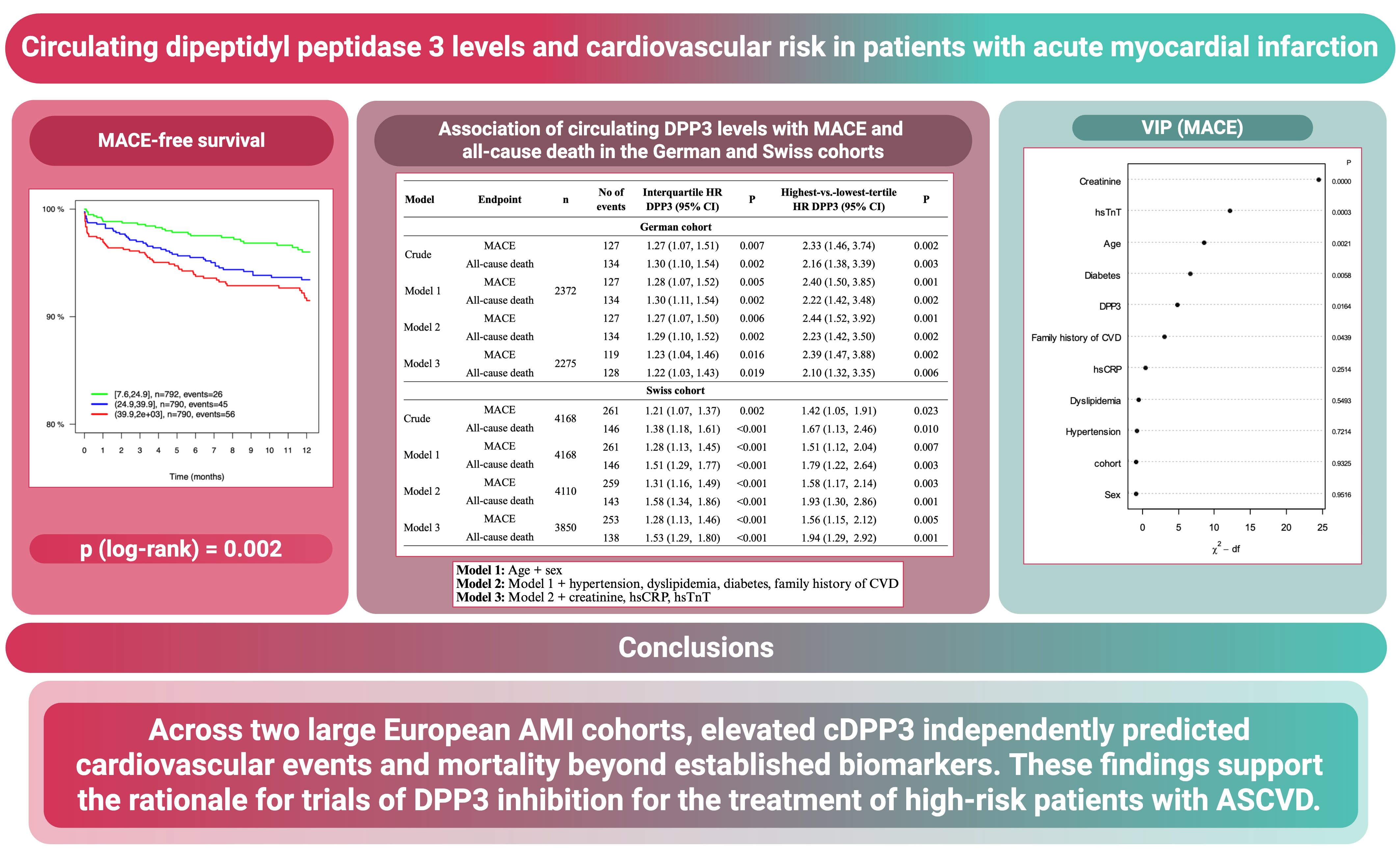 Conclusions: Across two large European AMI cohorts, elevated cDPP3 independently predicted cardiovascular events and mortality beyond established biomarkers. These findings support the rationale for trials of DPP3 inhibition for the treatment of high-risk patients with ASCVD.