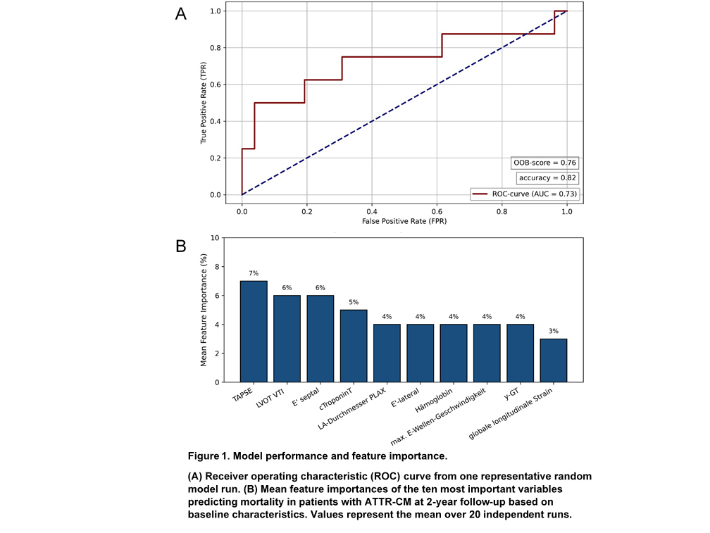 Results: From initial 160 variables, 54 model parameters remained after correlation analysis (Spearman correlation combined with manual selection) for prediction of mortality. Variables with a mean feature importance above 5 % over 20 runs for prediction of mortality were identified. The model performance from a representative run is shown in Fig. 1A. The average accuracy for the prediction of mortality across 20 runs was 0.76, the AUC was 0.65, and the mean out‑of‑bag score was 0.78. The most important predictors of mortality at baseline were TAPSE, left ventricular outflow tract velocity time integral (LVOT VTI), E’ septal and cardiac Troponin T. The top ten features ranked by mean feature importance are presented in Figure 1B.