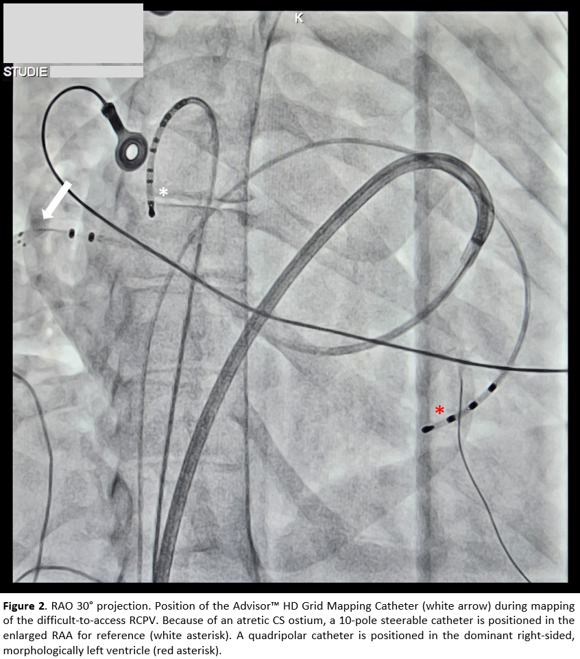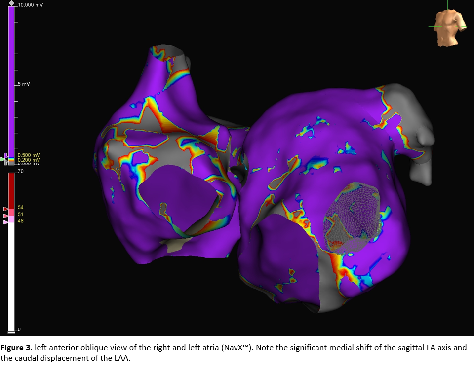 Electroanatomic mapping was performed with the EnSite™ NavX™. A significant medial shift of the left atrial sagittal axis was observed, along with a leftward and caudal displacement of the left atrial appendage. In nearly most of the left atrium, endocardial bipolar voltage was <1.5 mV, with only scattered low-voltage areas (LVA) <0.5 mV. The lateral pulmonary veins demonstrated preserved antral conduction, likely reflecting a previously deep balloon position. On the septal aspect, conduction into the RCPV was fully preserved.