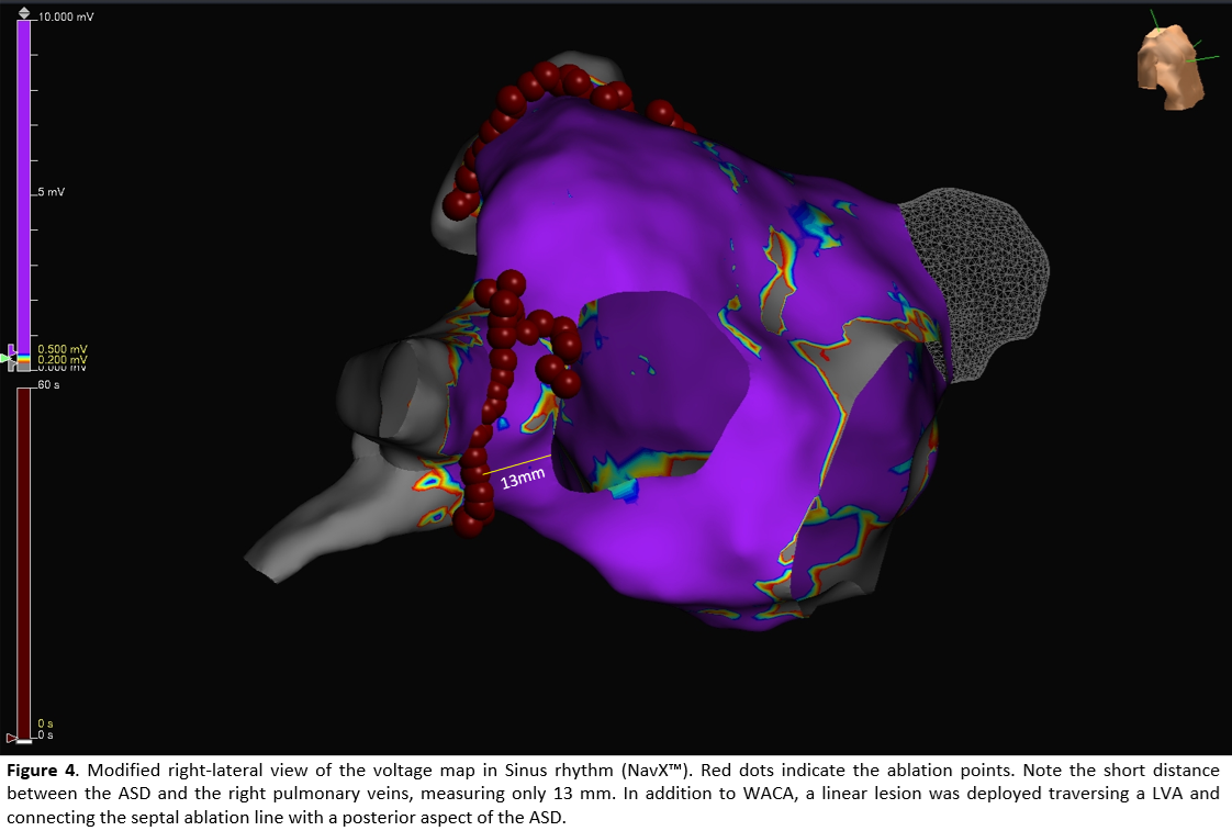 Ablation was guided by the Lesion Size Index (LSI) using a TactiFlex™ catheter, with a target LSI of 5.5 along the anterior wall and 5.0 along the posterior wall, resulting in first-pass isolation of all pulmonary veins. Due to the large ASD, maintaining a stable catheter position along the septal line was challenging, allowing for only a ~5-safety margin to the pulmonary veins inferiorly.