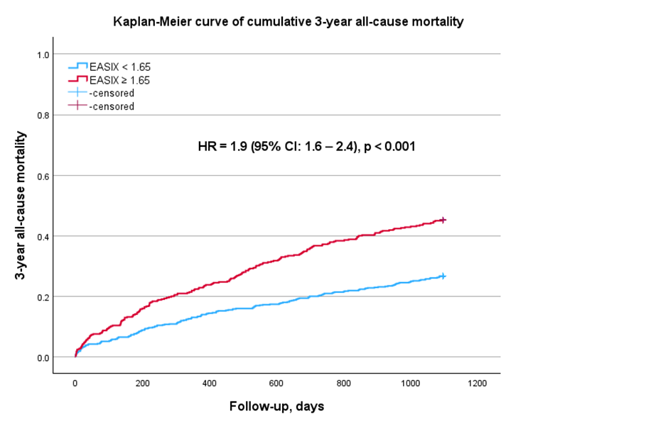 We conducted a retrospective analysis of 1084 patients with severe AS, who underwent TAVR between 2013 and 2021 at the Heart Center Bonn. The EASIX was measured pre-procedural. The optimal cut-off (EASIX ≥ 1.65) was determined using the Youden index. Its association with 3-year mortality was assessed using Kaplan-Meier survival analysis and Cox regression models. The primary endpoint was 3-year all-cause mortality.