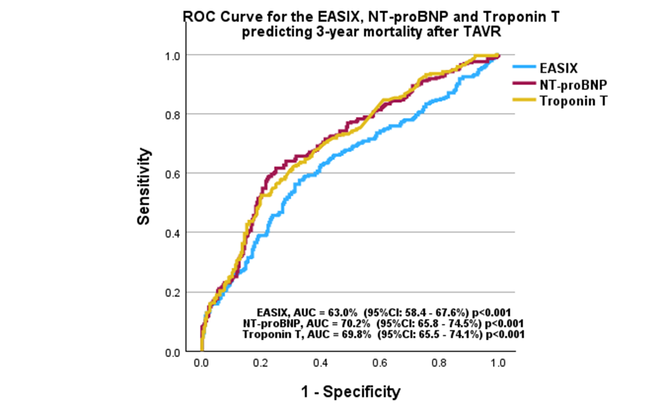 The EASIX is a significant predictor of 3-year all-cause mortality in patients undergoing TAVR. However, its predictive performance is lower than NT-proBNP and troponin T. Integrating EASIX with traditional cardiac biomarkers may enhance risk stratification in TAVR patients and improve personalized care.