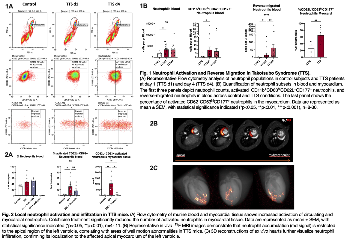 Peripheral blood (n=30) and myocardial biopsies (n=8) from TTS patients were obtained on days 1 and 4 post-diagnosis and compared with healthy controls (n=10). Immune phenotyping was performed using multiparameter flow cytometry. In parallel, a murine model of TTS was established via intraperitoneal epinephrine administration (2.5 mg/kg), mimicking stress-induced myocardial dysfunction. Serial cardiac MRI using a fluorine-based neutrophil-specific tracer enabled real-time visualization of immune cell infiltration and its temporal and spatial correlation with myocardial dysfunction. Neutrophil-targeted interventions included depletion with anti-Ly6G antibodies and colchicine-based anti-inflammatory treatment.
