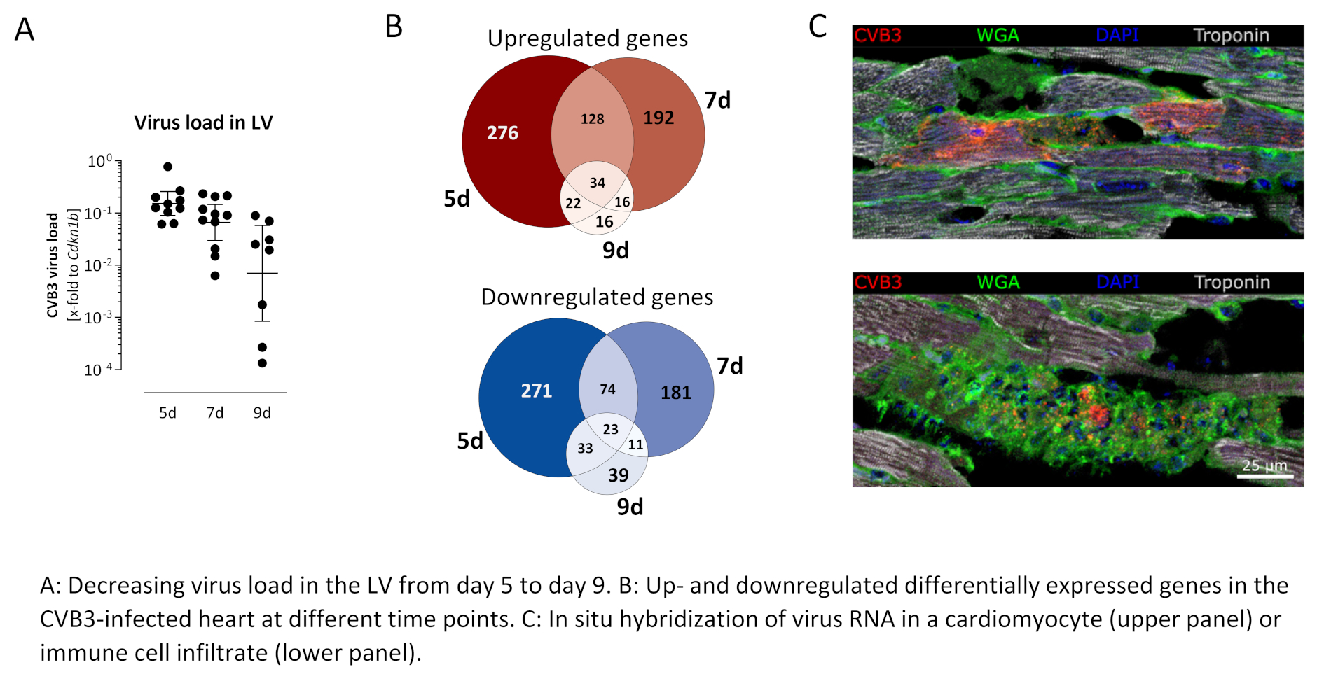 To better understand the course of immune responses during the disease progression, this project focus on a detailed time-course analysis of CVB3-induced myocarditis (5, 7 and 9 days post-infection). The time-course of immune response, virus load, and viral replication in the heart and in other organs involved in the immune response are examined via RNA sequencing and gene expression analysis. Furthermore, in vitro infection with CVB3 sheet light on the contribution of different cardiac and immune cell types to the disease progression.