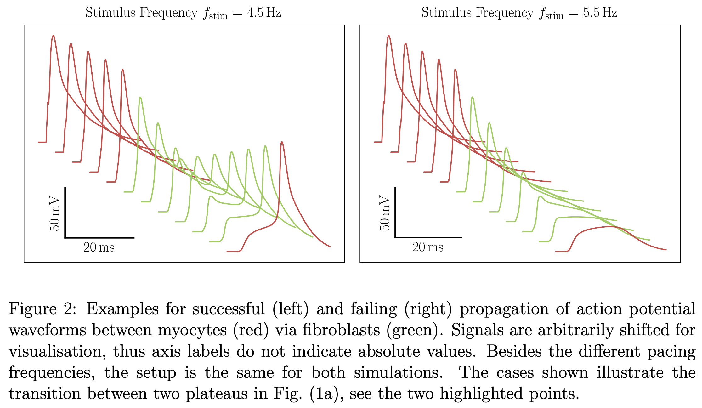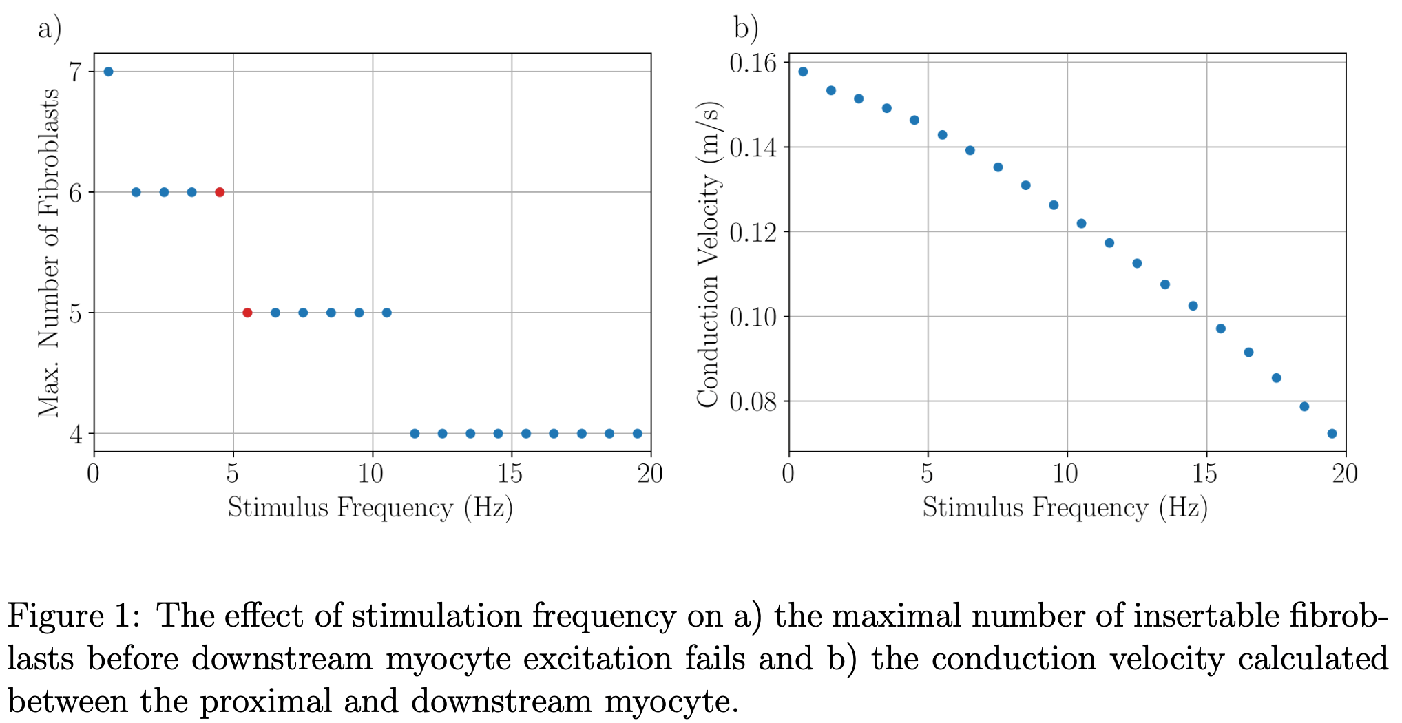 Results and Discussion. As expected for a passively conducting cable between the proximal and distal cardiomyocytes, downstream myocyte excitation failed when too many fibroblasts were introduced; this conduction failure occurred earlier (i.e. at lower fibroblast numbers) if the pacing rate was elevated, see Fig. (1a). One mechanism contributing to this frequency dependence is a reduction in conduction velocity when the pacing frequency is raised (Fig. 1b; for an example see Fig. 2). In follow-up studies, we will additionally include lateral fibroblast coupling to cardiomyocytes to model the scar border zone, experimentally shown to decelerate the approaching wave, and we will extend our models to 2D to connect the observed phenomena with experimentally identified contributions to arrhythmogenesis.